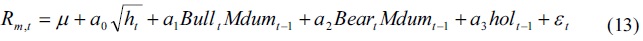 Table 7 illustrates the estimated results of equations (13) - (15). The effects of the changes in margin requirement in the bull and bear markets on the conditional long-run volatility are captured by the coefficients,