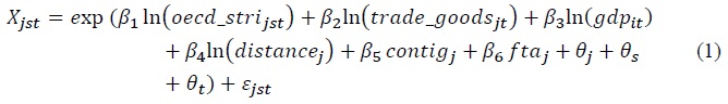 Studies on international trade recurrently utilize the gravity model to identify the factors that influence trade flows of services (Grosso and Shepherd, 2008; Benz, 2017; Nordås and Rouzet, 2017; Matuszczak, 2019; Hoekman and Shepherd, 2021; Nordås, 2023; Chen, 2024). As a result, we estimate a gravity model of trade in services using the Poisson Pseudo Maximum Likelihood (PPML) estimator, with partner country, sector, and time fixed effects. The dependent variable